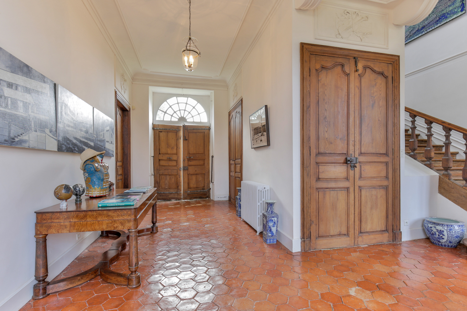 Au 1er étage, un perron ouvre sur hall d’entrée et un bel escalier en bois de style Louis XIII. Le hall dessert deux salons, une salle à manger et une grande cuisine, un bureau, wc, et une suite.