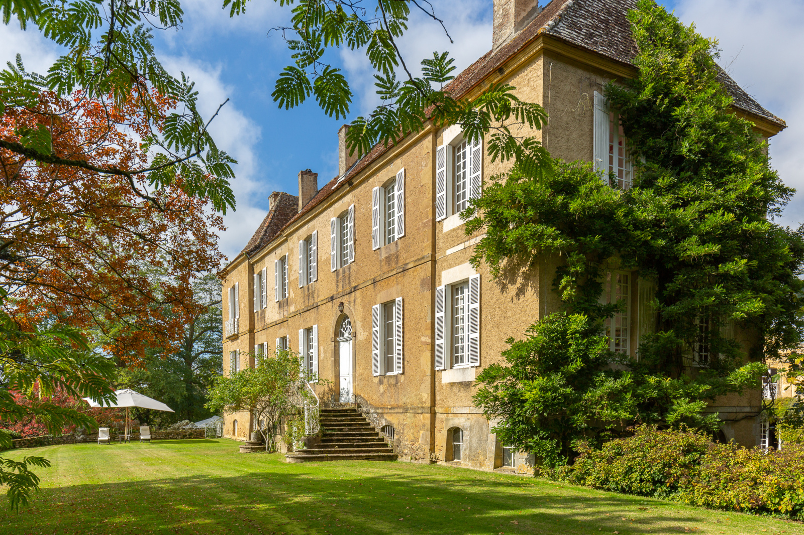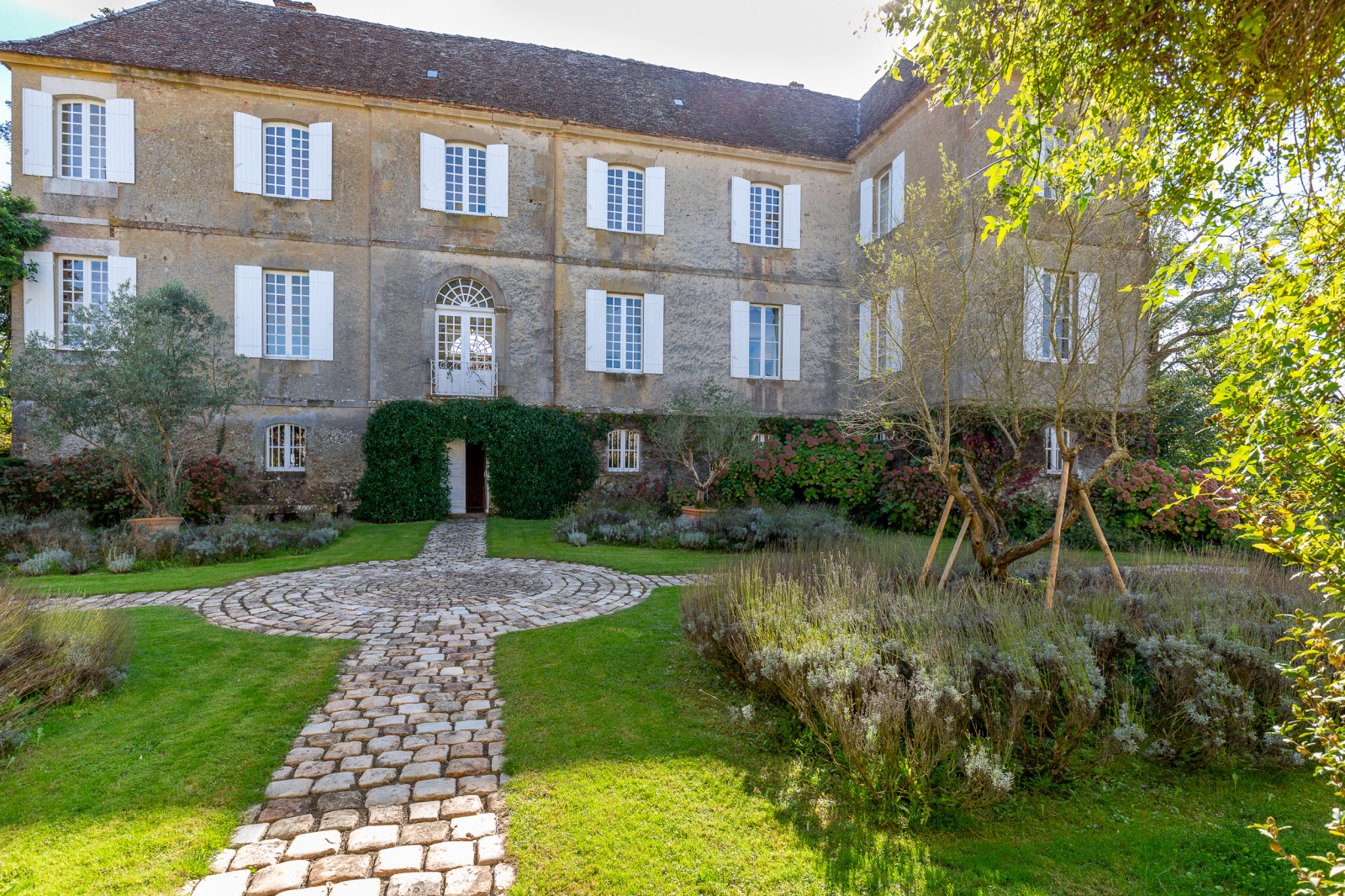 au bout d’une allée ombragée et privée, longeant un parc d’arbres matures, on arrive devant une grille. Sur la droite se trouve une aire de stationnement et une maison occupée par des gardiens. La grille ouvre sur une cour où une allée en pavés en pierre mène aux portes d’entrée du château et de ses anciennes écuries aménagées en maison d’hôtes qui se font face.