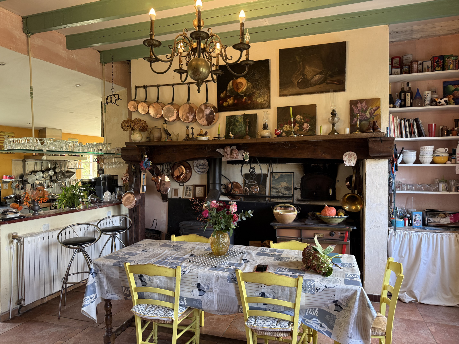 - en rez-de-chaussée : un hall d’entrée, une cuisine avec salle à manger et cheminée, une salle à manger, un salon, un bureau, une buanderie et une pièce de réception de 90m² avec des boiseries peintes, une cheminée et un plancher, communiquant avec un ancien chai converti en espace de stockage et chaufferie.
