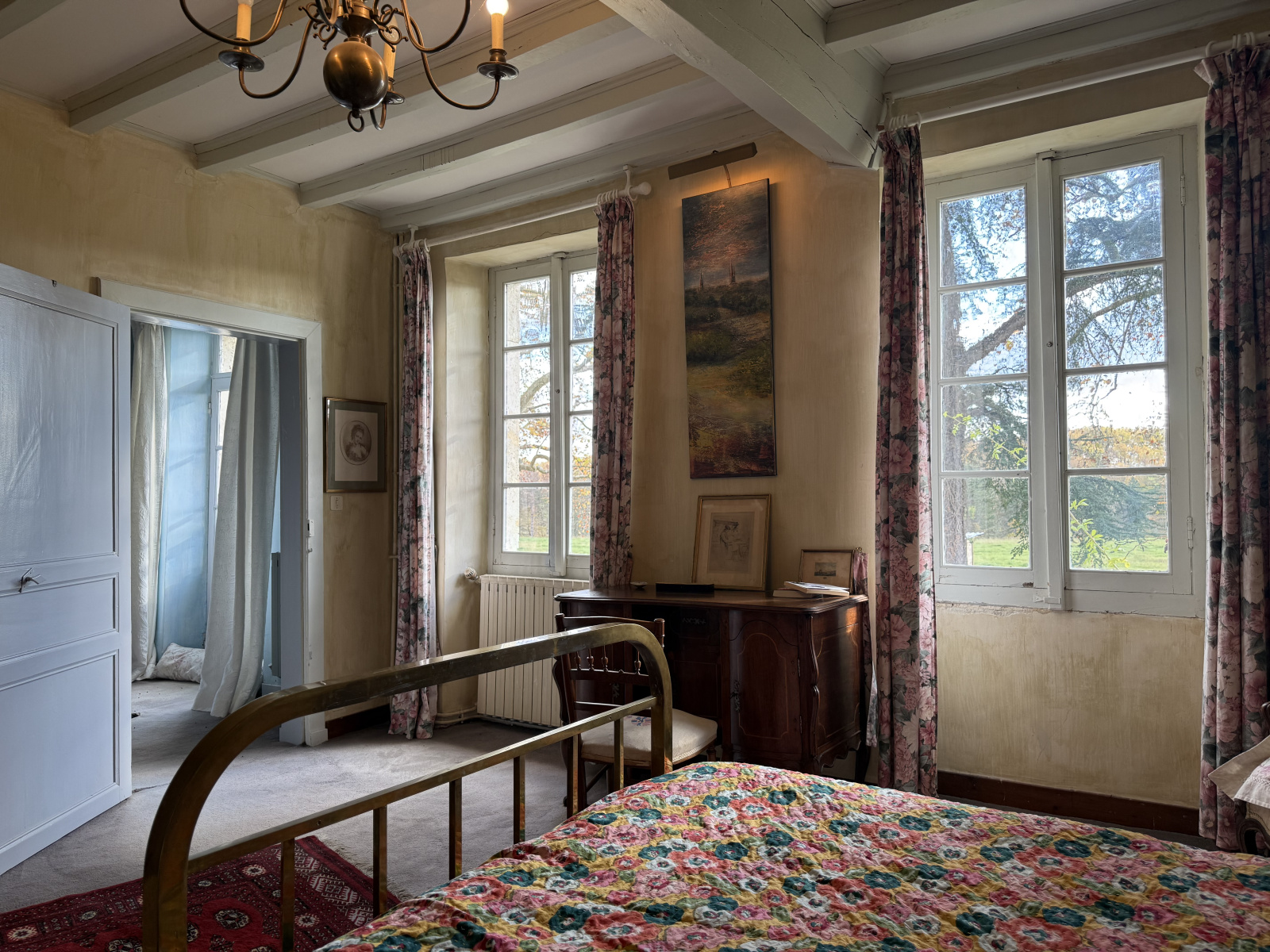 - L’on accède à l’étage par un escalier en volute, débouchant sur un palier distribuant trois chambres dont une avec salle de bains, et une deuxième salle de bains familiale avec wc séparé.