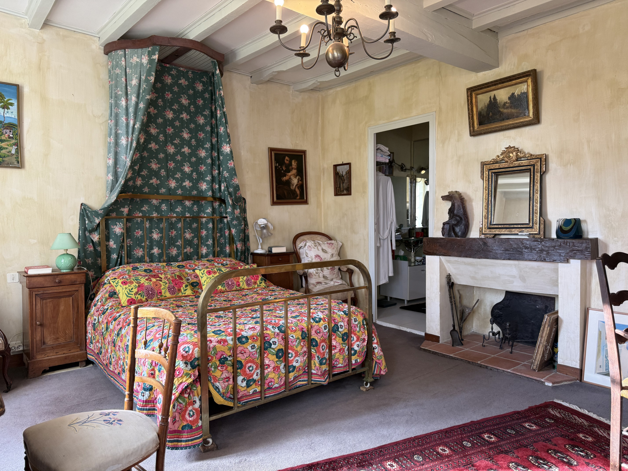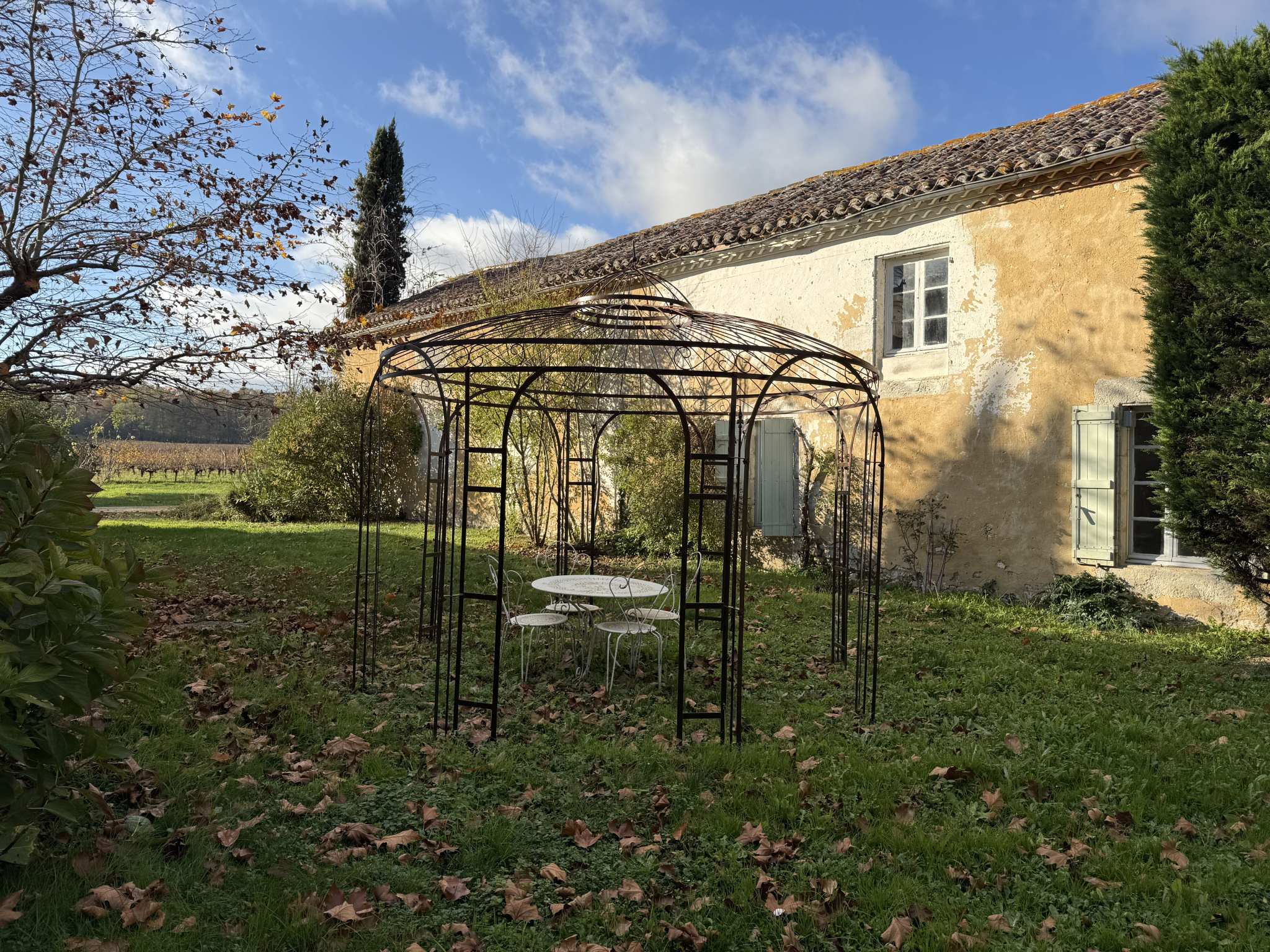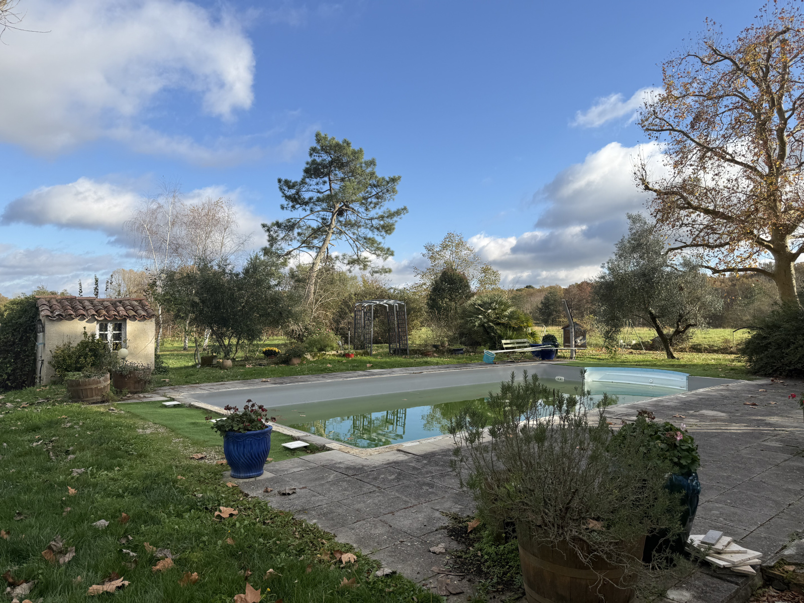 Le bâti est entouré d’un espace végétalisé avec de grands arbres matures, une allée d’arbres fruitiers, des espaces paysagés et une piscine de 12mx6m, avec pool house et terrasse autour.