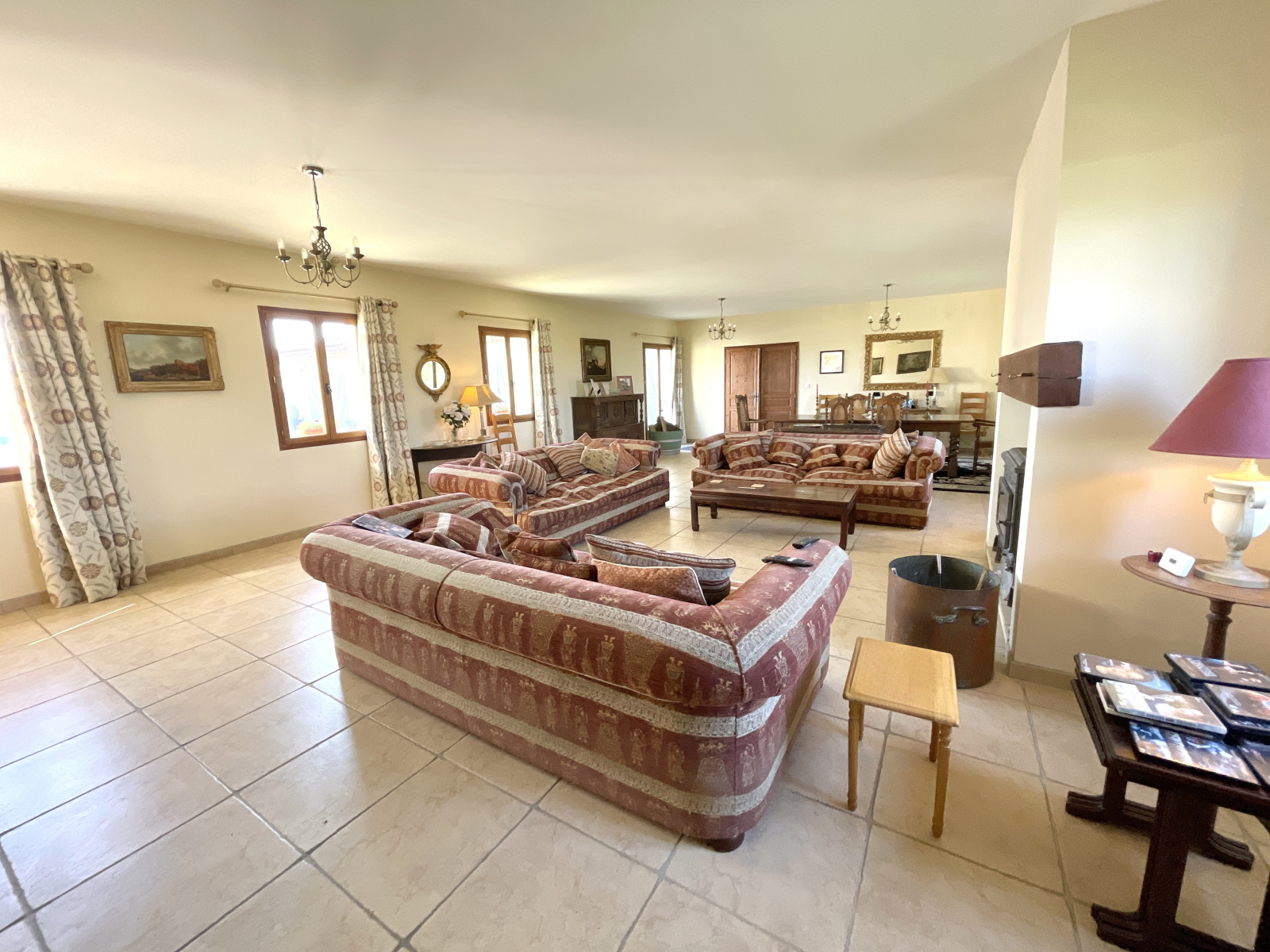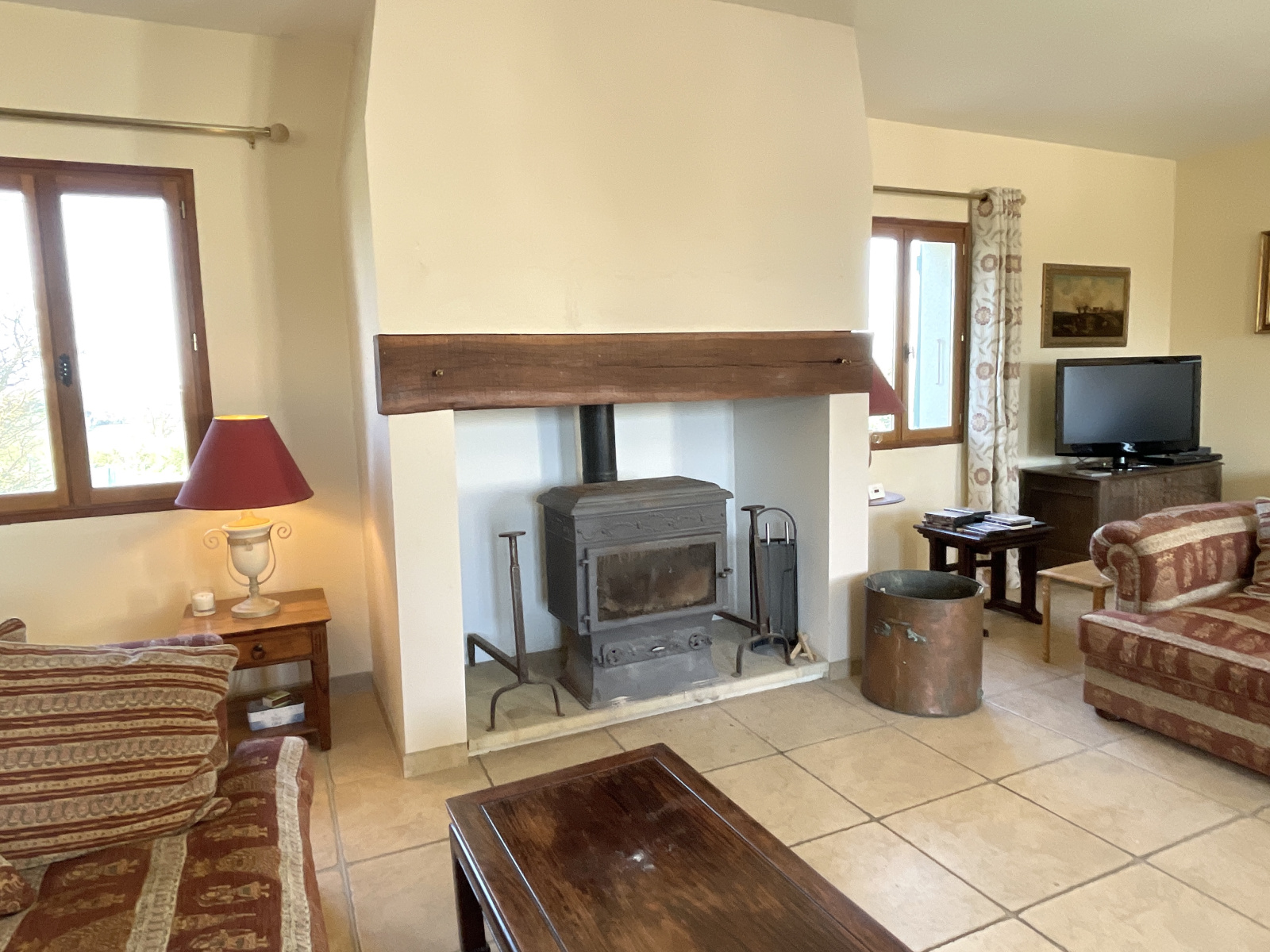 - Séjour de 73 m², baigné de lumière, doté d’une cheminée avec poêle à bois, créant une atmosphère chaleureuse et conviviale.