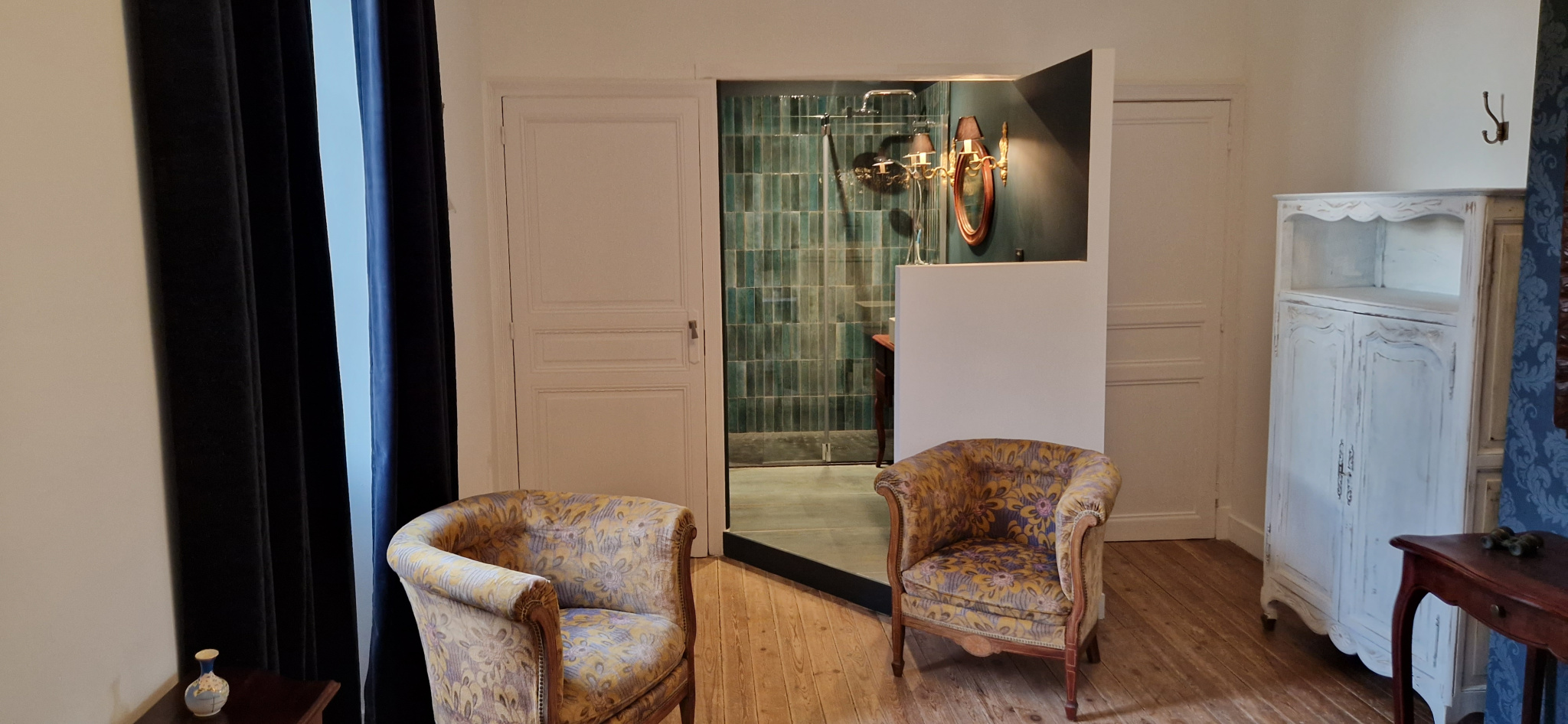 Également en rez-de-chaussée: une suite parentale avec portes de placards anciens et sa salle d’eau avec douche à l’italienne.
