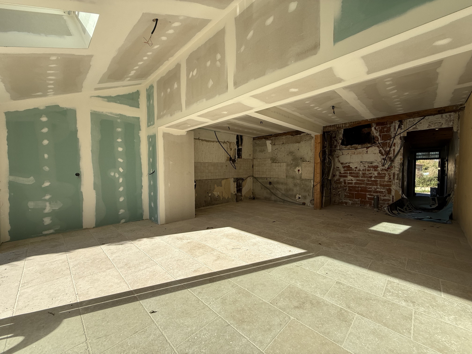- Au rez-de-chaussée : une entrée, un séjour avec coin cuisine en attente, une chambre, une salle d’eau et un WC.