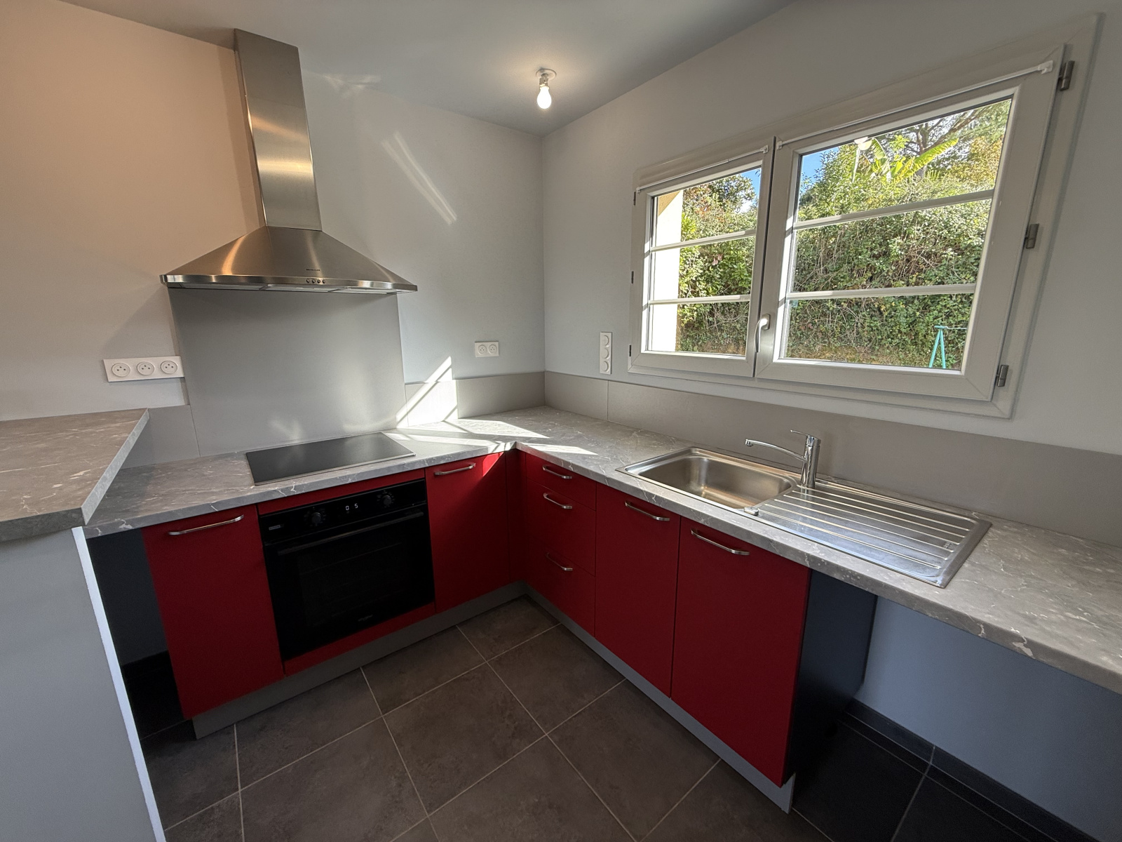 un séjour lumineux avec cuisine ouverte, trois chambres confortables, une salle d’eau avec WC, ainsi qu’un WC indépendant.