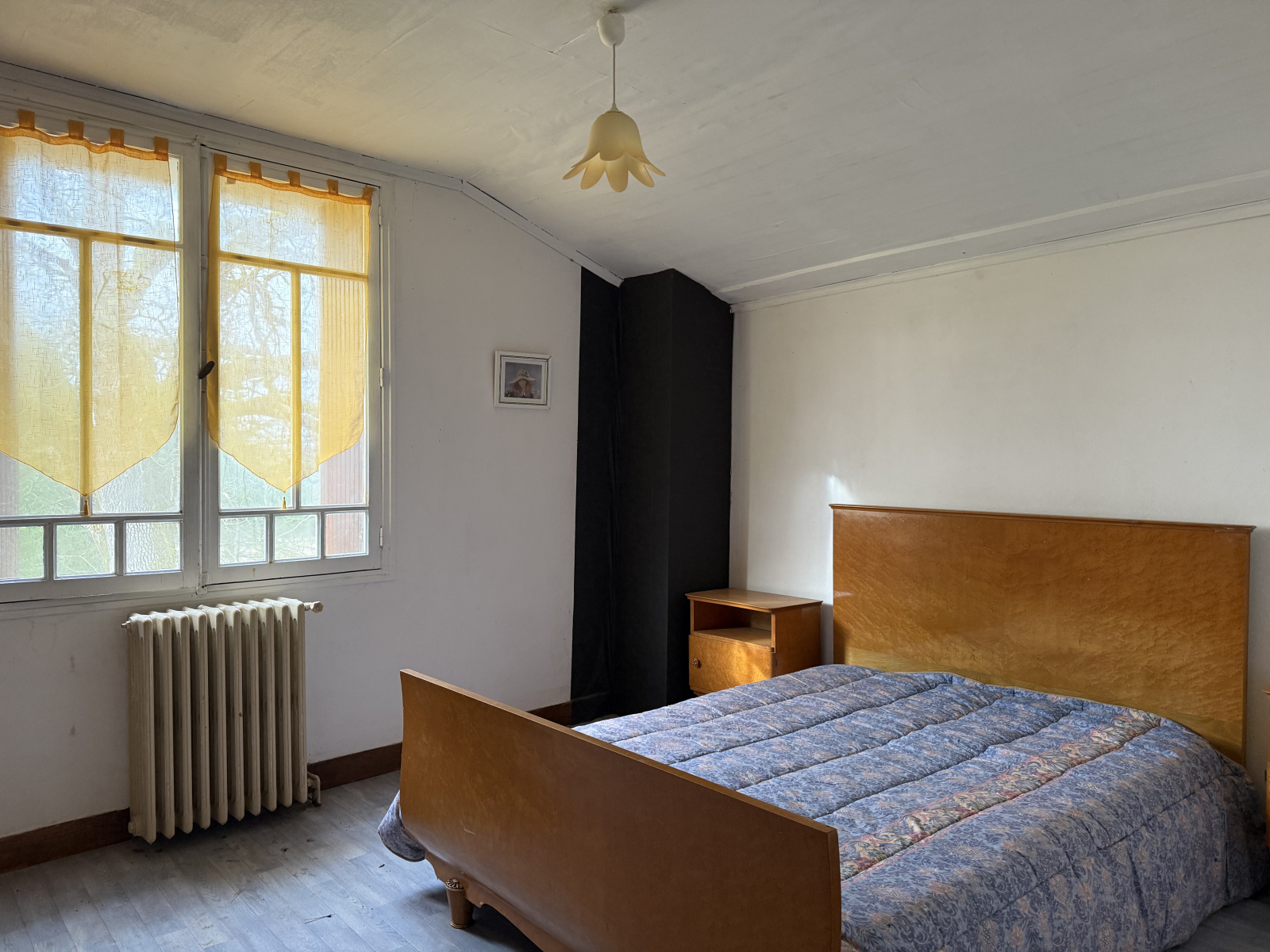 À l’étage, deux chambres, une salle de bains et un WC.