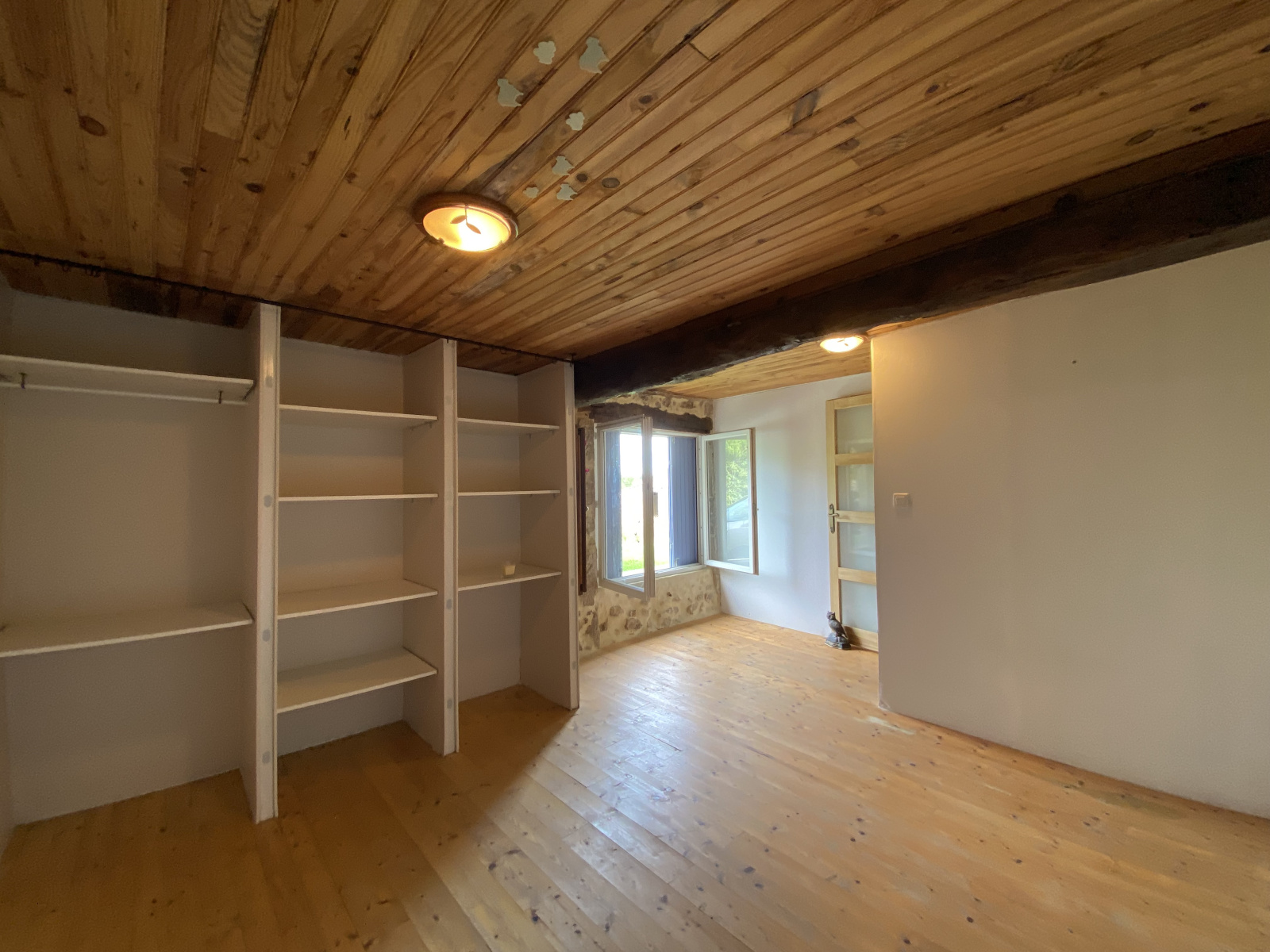 L’entrée donne accès d’un côté à une salle à manger avec cheminée équipée d’un insert et cuisine ouverte (non équipée), ouvrant vers 2 chambres.