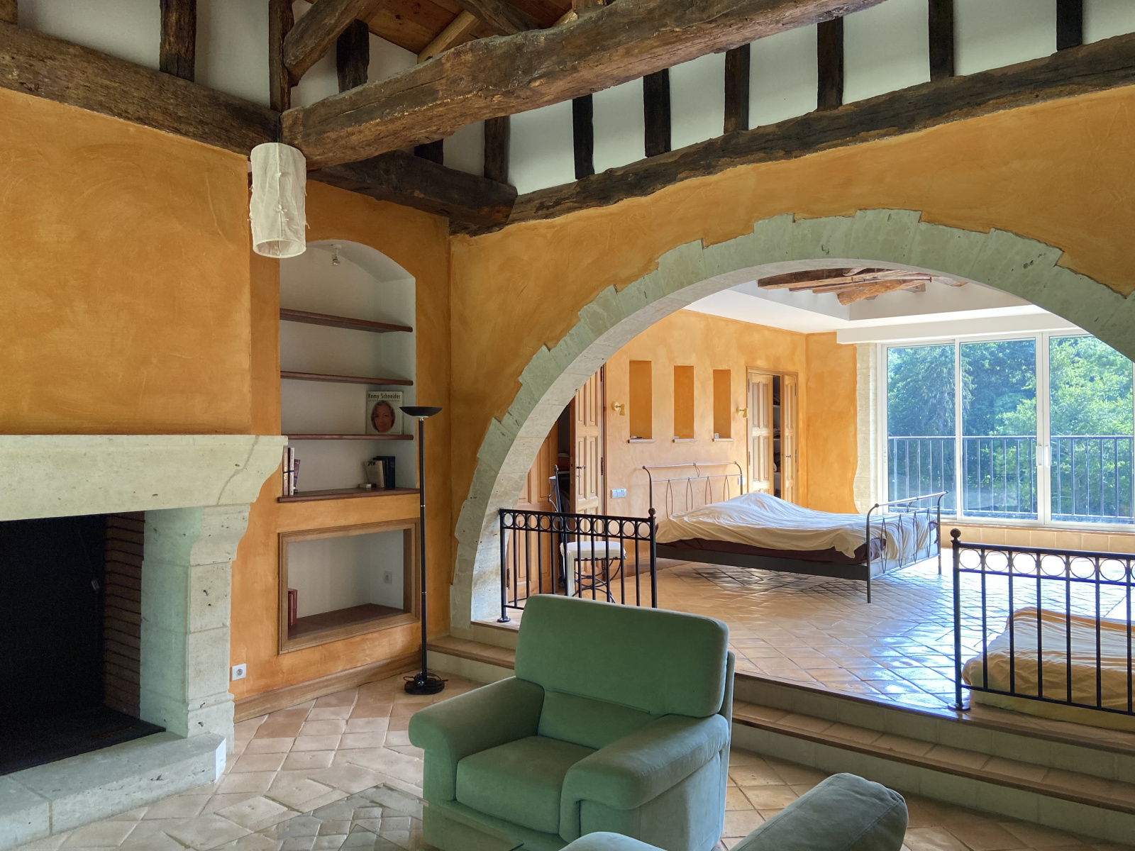 Sols en terre cuite, cheminées en pierre, azulejos (carrelage à l’espagnole), poutres en chêne, doubles portes intérieures haussmannienne en bois, vieux pressoir, évier en pierre, bibliothèque en bois de chêne chevillés, plafond en torchis.