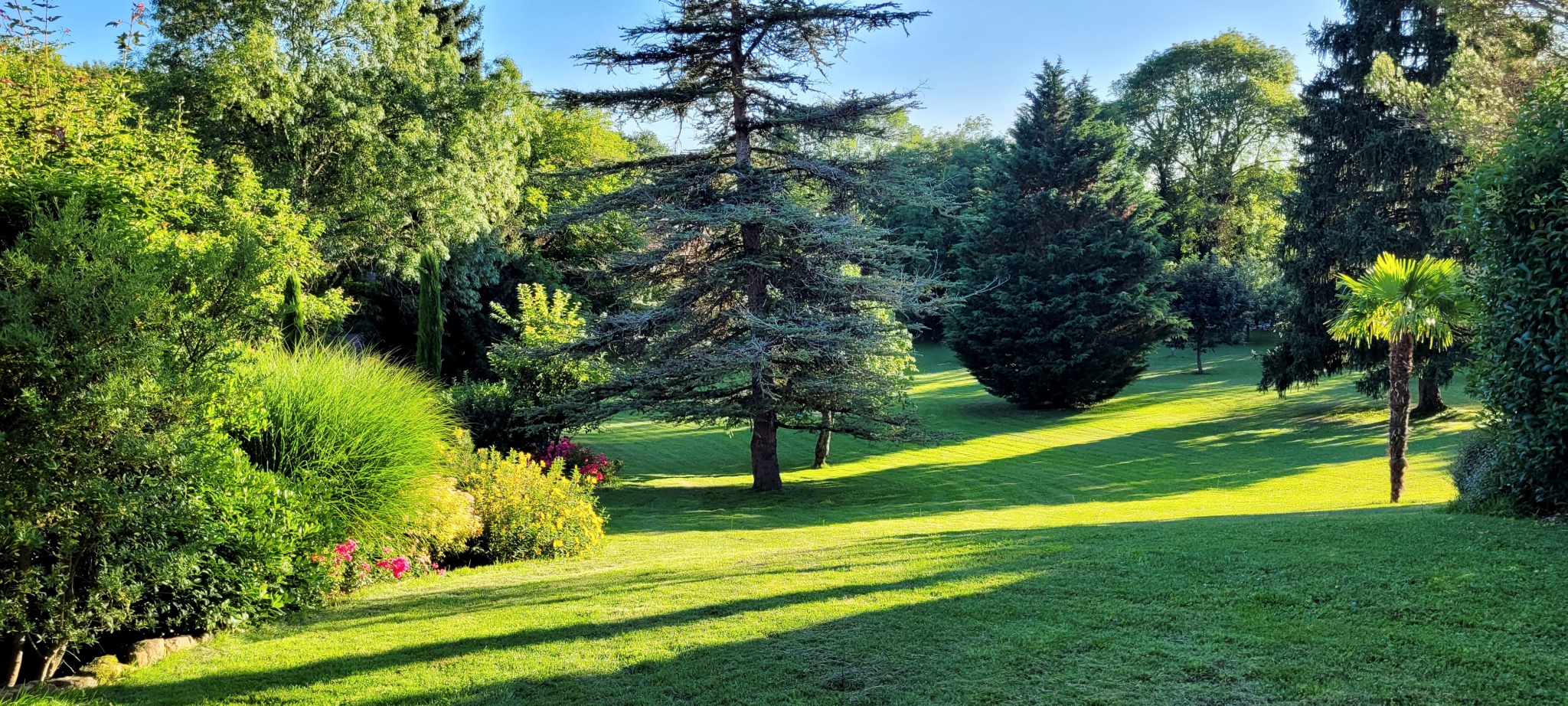 L’ensemble du parc est magnifiquement aménagé : murets en pierre, massifs fleuris, espaces engazonnés et arbres matures.