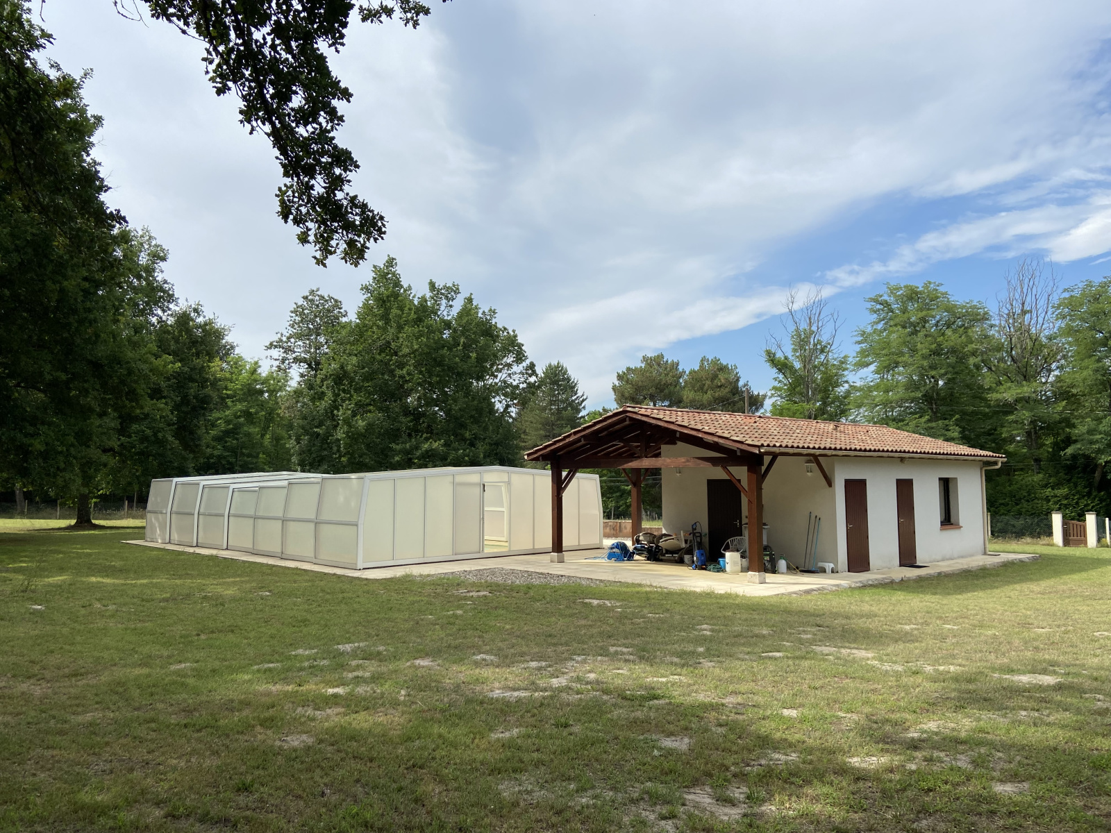 Par l’extérieur on accède à une chambre avec sa salle d’eau et WC, non attenant un poolhouse avec studio, un bureau, une pièce de stockage, un garage, une piscine couverte de 11x5au sel.